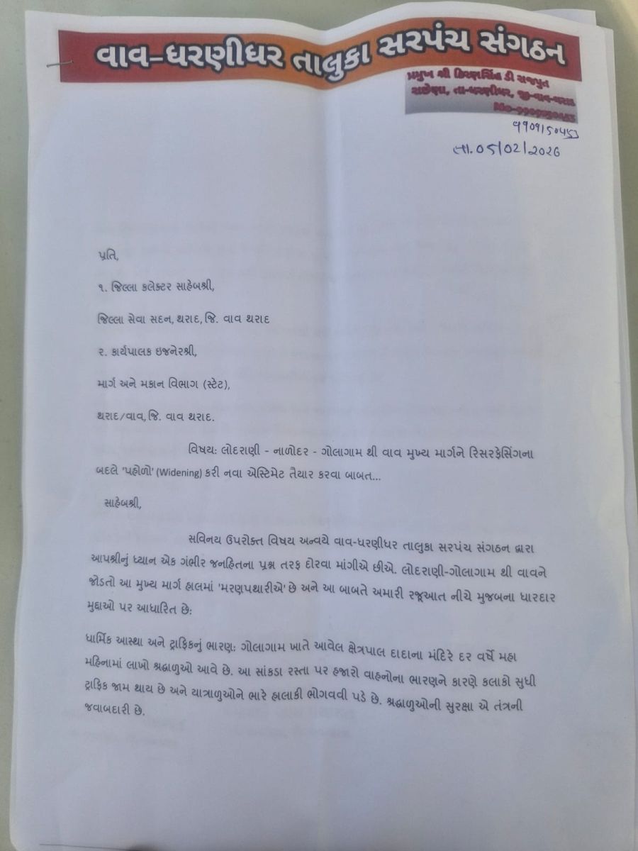 લોદરાણી–નાળોદર–ગોલાગામથી વાવને જોડતો મુખ્ય માર્ગ હાલ અત્યંત જર્જરિત હાલતમાં હોવાથી તેને માત્ર રિસરફેસિંગ કરવાની જગ્યાએ પહોળો (વાઈડનિંગ) કરવા માટે નવો ટેકનિકલ એસ્ટિમેટ તૈયાર કરવામાં આવે તેવી તીવ્ર માંગ વાવ–ધરણીધર તાલુકા સરપંચ સંગઠન દ્વારા કરવામાં આવી છે.